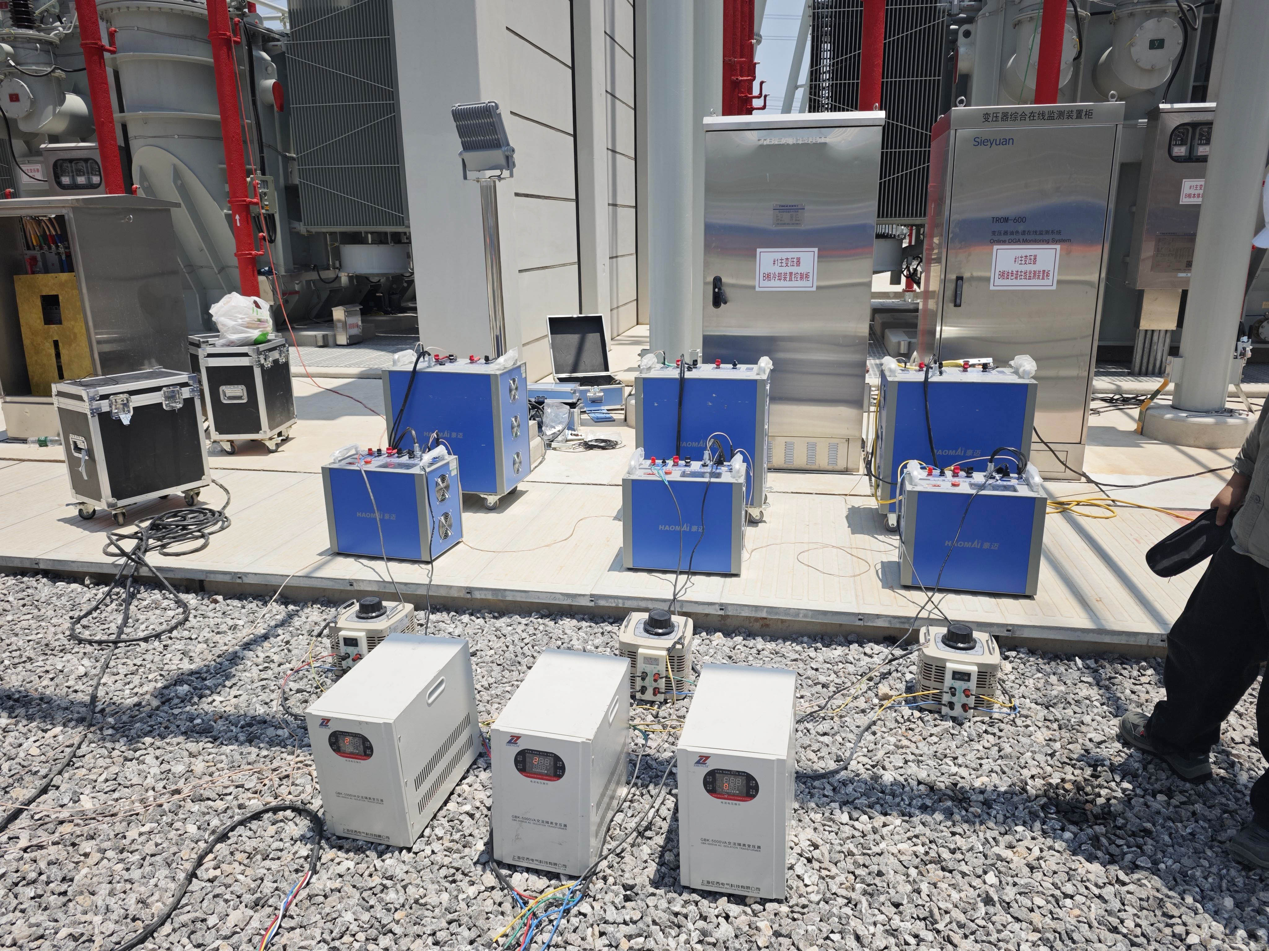 試驗前準備:根據變壓器銘牌參數,確定最佳通流加壓方案(如高壓側對中壓側、中壓側對低壓側等)。通過理論計算,確定試驗方案細節(jié)(如電壓、電流值、電容配置)。