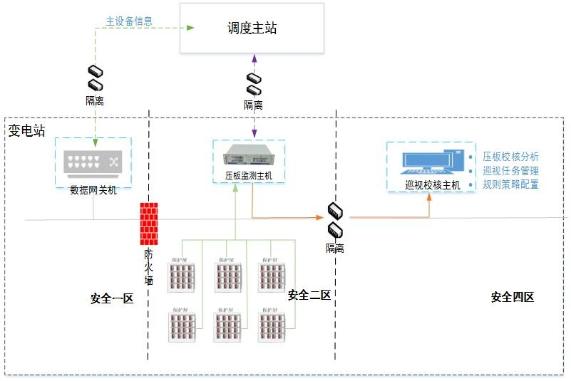 安全架構(gòu):嚴格遵循網(wǎng)絡(luò)安全規(guī)范,壓板監(jiān)測系統(tǒng)部署于I/II區(qū),壓板巡視校核系統(tǒng)部署于IV區(qū),通過單向隔離裝置傳輸數(shù)據(jù)。(支持第三方IEC61850/IEC104接入監(jiān)控/遠動/保信子站)