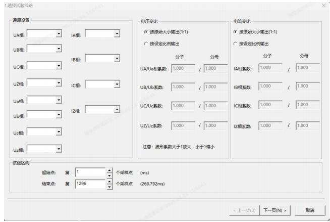波形反演參數(shù)設(shè)置界面包含 “ 試驗(yàn)線路選擇 ”“ 通道設(shè)置 ”“ 電壓變比 ”“ 電流變比 ”“ 相系數(shù)設(shè)置 ”“ 試驗(yàn)區(qū)間 ” 等模塊,底部有 “ 上一步 ”“ 下一頁(yè) ”“ 取消 ” 按鈕 。