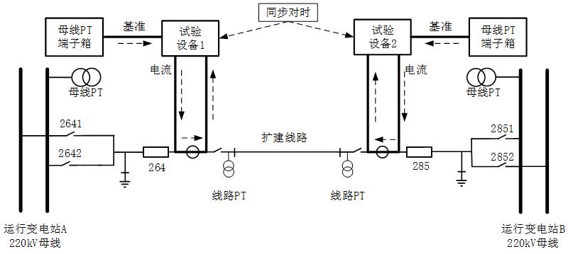 線路改擴(kuò)建通常為兩側(cè)線路同時(shí)進(jìn)行,傳統(tǒng)方法通常為本側(cè)保護(hù)裝置自環(huán),單側(cè)加量進(jìn)行后備保護(hù)向量驗(yàn)證,難以進(jìn)行差動(dòng)保護(hù)向量驗(yàn)證。國(guó)網(wǎng)公司 Q/GDW 12690-2025 《負(fù)荷模擬式繼電保護(hù)向量檢查試驗(yàn)導(dǎo)則》明確提出了 AB 站線路差動(dòng)保護(hù)向量檢查方法。兩站均以系統(tǒng)電源為基準(zhǔn)(或采取對(duì)時(shí)同步),分別用試驗(yàn)設(shè)備模擬一次負(fù)荷電流流經(jīng)電流互感器,檢查線路差動(dòng)保護(hù)向量是否正確。