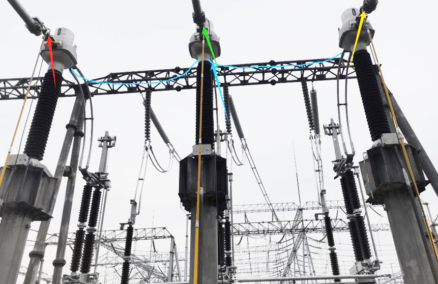 由于兩站都采用 AIS 架空接線,變電站側(cè)試驗(yàn)使用一臺(tái)三相電流源在 2212 間隔 CT 進(jìn)行一次升流,將試驗(yàn)設(shè)備三相輸出線分別夾在三相電流互感器 P1 位置注流,過(guò)電流互感器之后使用一次三相短接線短接接入至通流設(shè)備的 N 實(shí)現(xiàn)回流(若條件允許可通過(guò)地刀回流),盡可能減少通流路徑范圍從而規(guī)避對(duì)運(yùn)行系統(tǒng)的影響。風(fēng)電場(chǎng)側(cè)試驗(yàn)使用一臺(tái)三相電流源在 2211 間隔 CT 進(jìn)行一次升流,直接將試驗(yàn)儀器三相輸出線分別夾在三相電流互感器 P1 位置注流,過(guò)電流互感器后使用一次三相短接線短接接入至通流設(shè)備的 N 實(shí)現(xiàn)回流,盡可能減少通流路徑范圍以規(guī)避對(duì)運(yùn)行系統(tǒng)的影響。