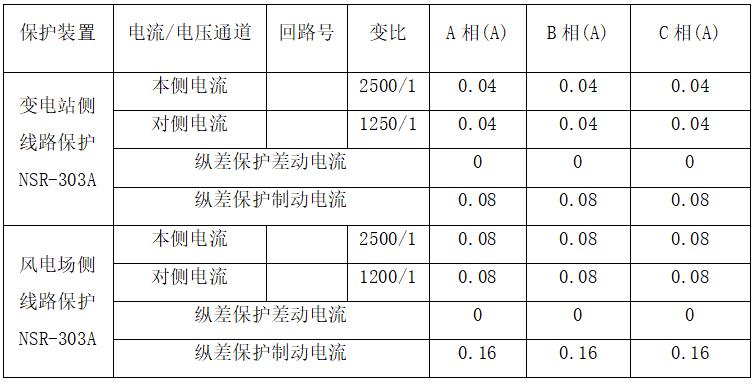 變電站側(cè)實(shí)際通流方向?yàn)槟妇€流向線路,風(fēng)電場(chǎng)側(cè)實(shí)際通流方向也為母線流向線路,保護(hù)裝置顯示電流均為折算后電流,差動(dòng)電流為 0 ,說(shuō)明線路差動(dòng)保護(hù)向量正確。