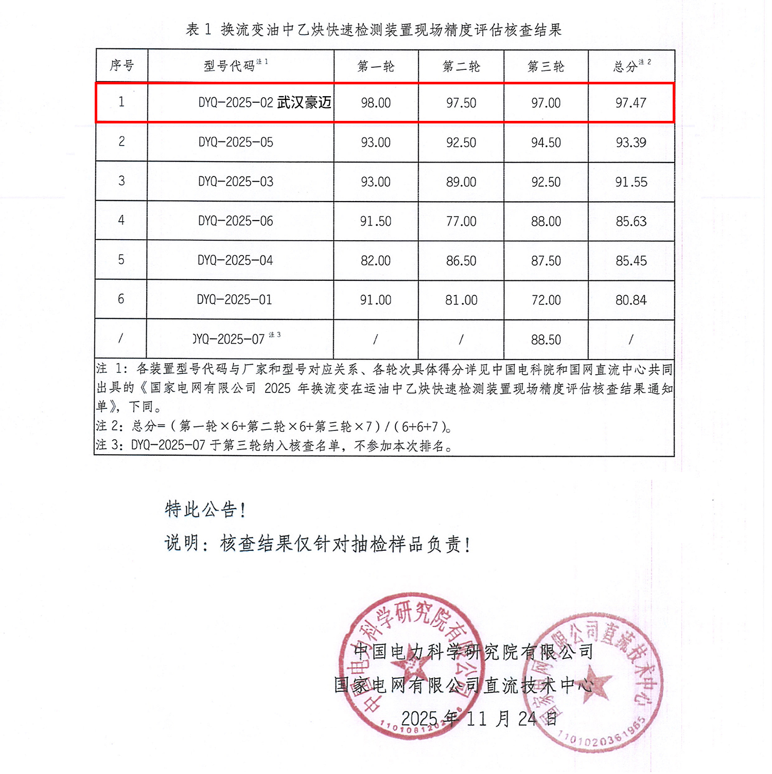 2025年12月23日,由中國(guó)電科院、國(guó)網(wǎng)直流中心共同承擔(dān)的2025年度換流變?cè)谶\(yùn)油中乙炔快速檢測(cè)裝置現(xiàn)場(chǎng)精度評(píng)估結(jié)果正式公布。武漢豪邁光電科技有限公司自主研發(fā)生產(chǎn)的PASL-1000激光光聲光譜油中乙炔快速檢測(cè)裝置在測(cè)量精度、響應(yīng)速度、抗干擾能力等核心指標(biāo)上表現(xiàn)搶眼,三輪評(píng)估核查均以絕對(duì)優(yōu)勢(shì)位列榜首,最終榮獲總分第一的優(yōu)異成績(jī)。該裝置將乙炔最低檢測(cè)限值下探到0.05μL/L,為變壓器故障預(yù)警樹立了新的技術(shù)標(biāo)桿。