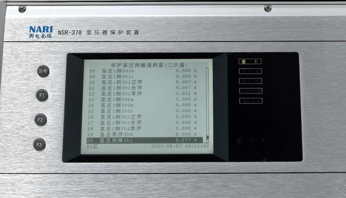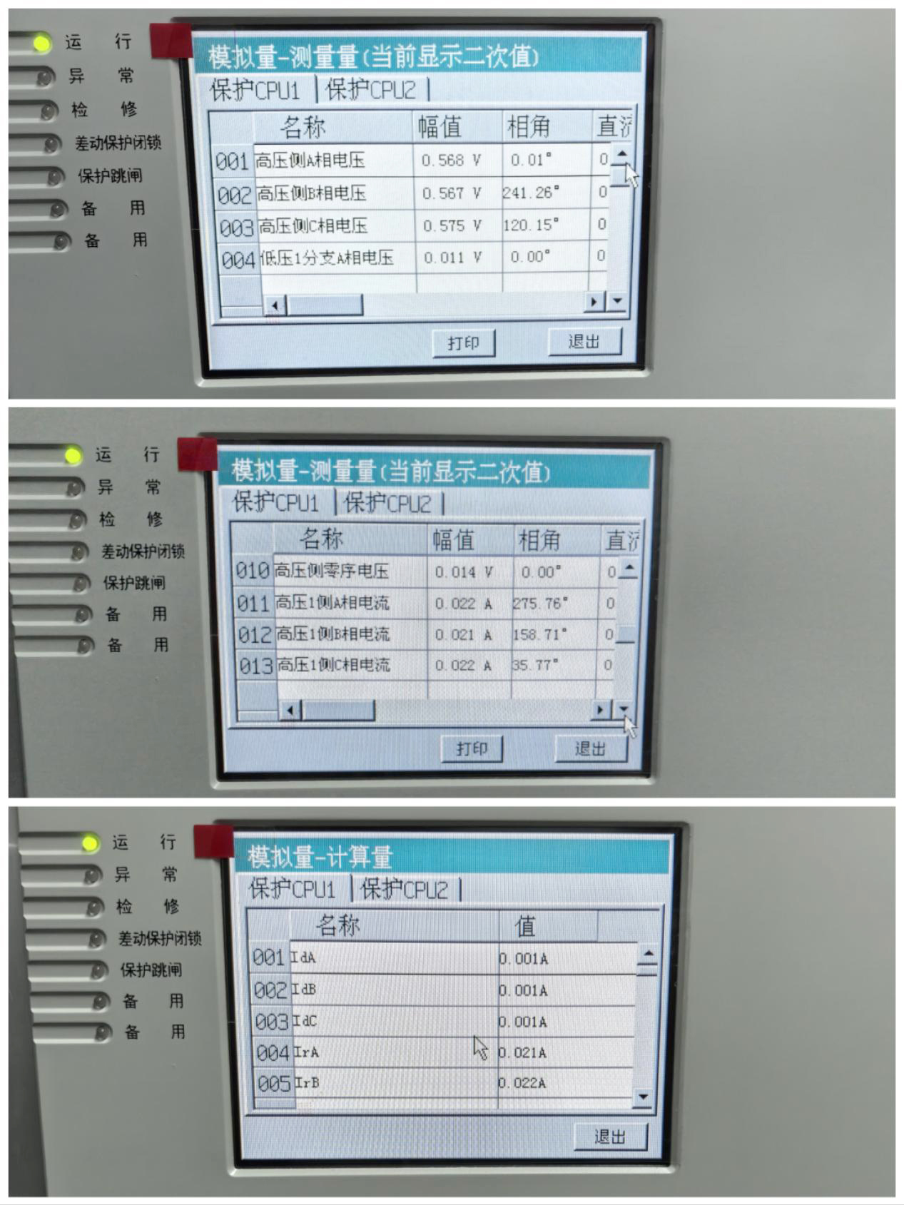 同理主變保護(hù)從母線 P1 流過 P2 至主變,主變高壓側(cè)電流角度約為 0.22A ∠ 270 °( -90 °)正序,主變保護(hù)差流計(jì)算值為 0 。由此可得,高壓側(cè)線路保護(hù)一二次接線正確。主變保護(hù)電壓電流角度、差流等符合預(yù)期結(jié)果。