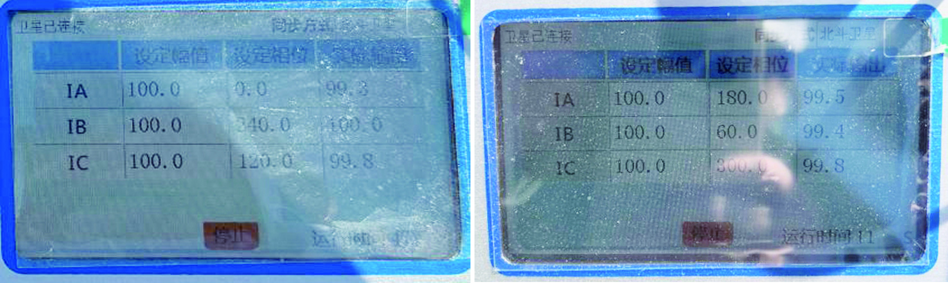 試驗設備開機后,選擇 GPS 對時方式,兩站之間可通過 GPS 同步對時。對上時后按照變電站側電流源一次施加電流 A 相 100A ∠ 0 °, B 相 100A ∠ 240 °, C 相 100A ∠ 120 °,風電場側電流源一次施加電流 A 相 100A ∠ 180 °, B 相 100A ∠ 60 °, C 相 100A ∠ 300 °分別輸出,通過 秒脈沖同步觸發(fā),保證過零時刻兩邊電流輸出相位同步。 在保護裝置 查看采樣和差流,完成線路差動保護向量校核試驗。