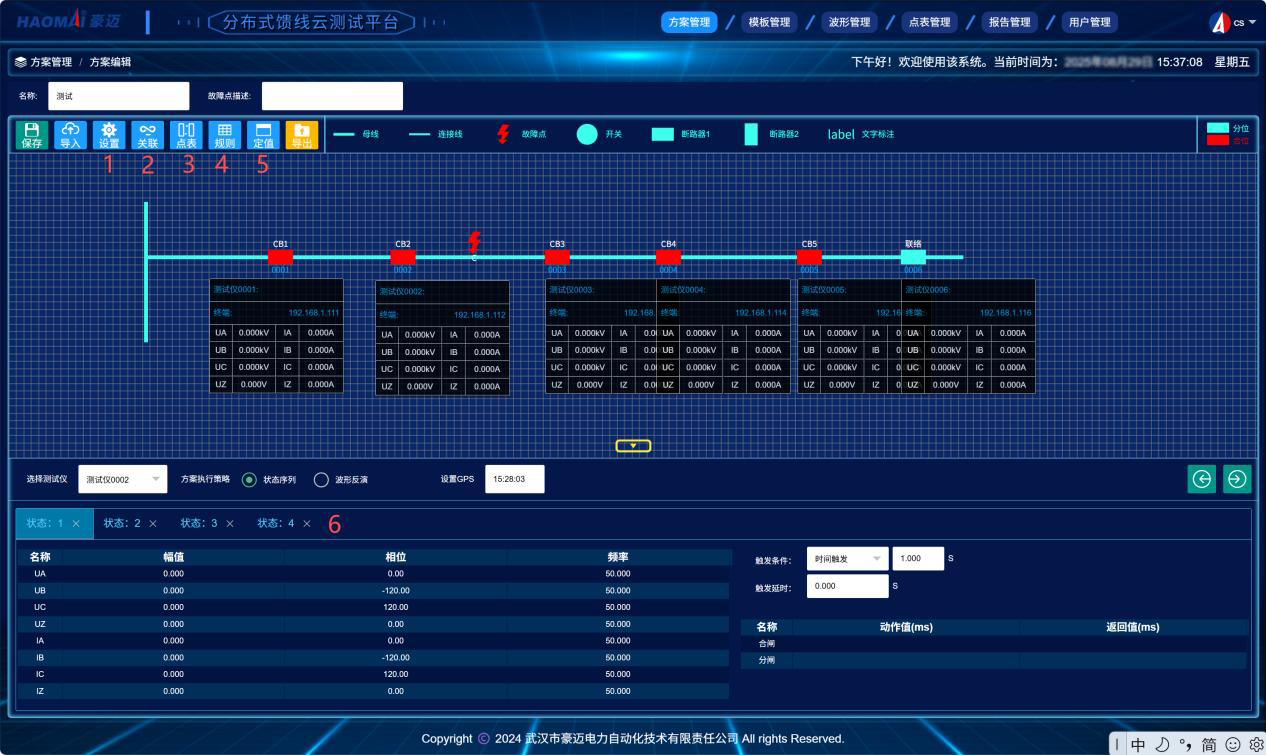 通過模擬開關(guān)盒與測試軟件協(xié)同配合, 實(shí)現(xiàn)對 數(shù)字式終端 FA 故障邏輯驗(yàn)證。測試 項(xiàng)目 包括:故障信號自動識別與上報 、 保護(hù)動作邏輯判斷與執(zhí)行 、 與上級系統(tǒng)聯(lián)調(diào) 及 信息上傳 。 系統(tǒng)完整演示從故障發(fā)生到隔離、再到供電恢復(fù)的全過程,驗(yàn)證 FA 策略可行性與平臺處理實(shí)時性。